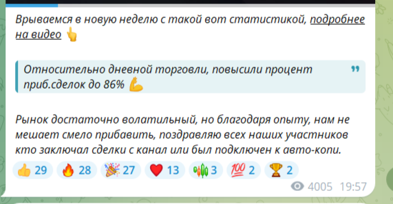 Неизвестно, на какой платформе эксперт предлагает своей аудитории торговать и закрывать настолько успешные сделки, что получать по ним прибыль в размере +80%.