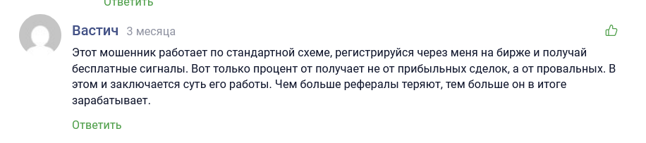 Также люди отмечают, что трейдер применяет классическую схему развода — предлагает регистрироваться на нелегальной бирже через его реферальную ссылку, а сам получает процент не от прибыльных сделок, а от провальных.