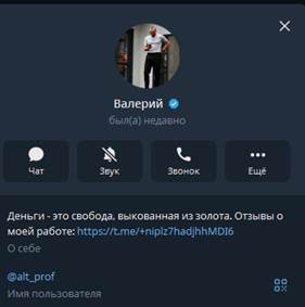 Чаще всего трейдер публикует сообщения о том, что он открывает особенный приватный проект. В каждом таком посте пишется, что осталось последнее место на трейд. Это мошенническая манипуляция. Люди будут быстрее искать как можно больше денег, чтобы успеть поучаствовать в проекте. Обращаться нужно к нему по его юзернейму Alt Prof. Трейдер Валерий скрывает свою видимость в сети. Поэтому не верится, что он может ответить. Отсутствие прозрачности в отношении юридического статуса и истории создания может свидетельствовать о попытке избежать ответственности в случае возникновения проблем.