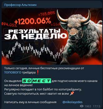 Также на Professor Altcoin часто рекламируются каналы других трейдеров. Недавно Валерий посоветовал личные бесплатные рекомендации от топового инвестора Николая. Он якобы выделил 50 мест в проекте только для подписчиков обозреваемого нами человека. Как указывается, он регулярно попадает в топ байбит по копитрейдингу. Снова используется манипуляция на малое количество мест. Валерий советует поторопиться, ведь для всех не хватит.
