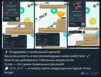 У канала имеется отдельная группа с отзывами о проекте. Все они положительные. Публикуются скриншоты переписок с Alt Prof. Трейдер поздравляет всех своих клиентов с прибыльной сделкой. И чтобы подкрепить надежды еще не решившихся пользователей, он пишет о том, что поможет найти следующие выгодные точки входа. Он считает, что его решения правильные и самые лучшие. В скриншотах видно, что он якобы переводит подписчикам огромные суммы. Около 500-600 тысяч рублей. Но такие отзывы легко подделать. Стоит написать своим друзьям и попросить подыграть. Или можно нанять специальных людей, которые за небольшую сумму сделают дело.