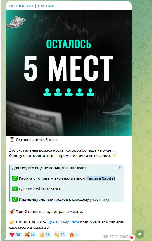 Проводник Trading – сообщество в Телеграм, автором которого выступает некий Alex Helptrade. Аудитории автор рассказывает о том, что имея депозит в 300 долларов смог сделать целое состояние, а теперь с ним работают крупные инвесторы, имеющие от 1 миллиона долларов на депозите. Всем подписчикам он предлагает индивидуальную работу. Разберемся, насколько безопасна работа с проектом.