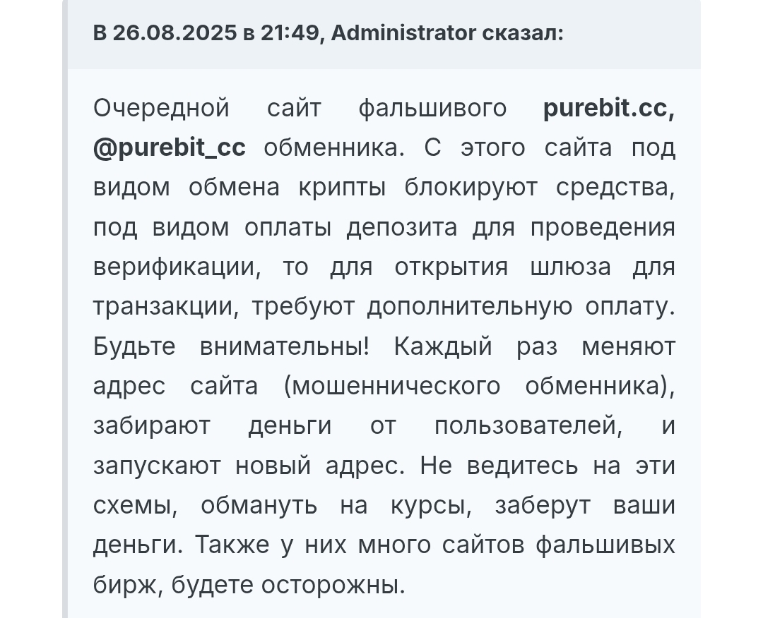 Пункт обмена криптовалют Purebit Cc, отзывы пользователей об обменнике Пуребит