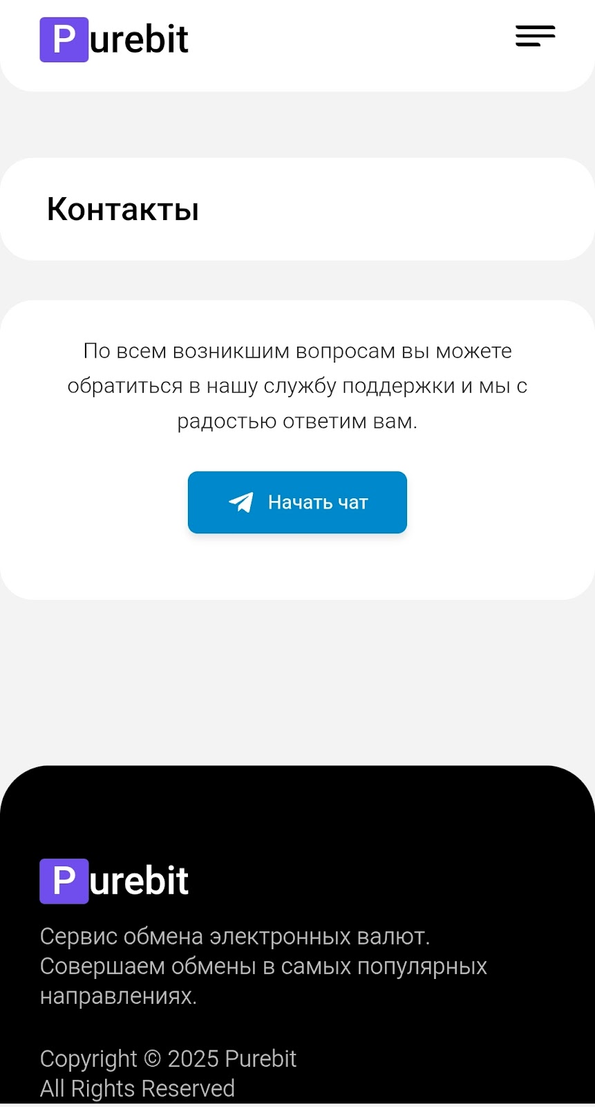 Единственный канал связи – чат в мессенджере Телеграмм PureBit Exchange.