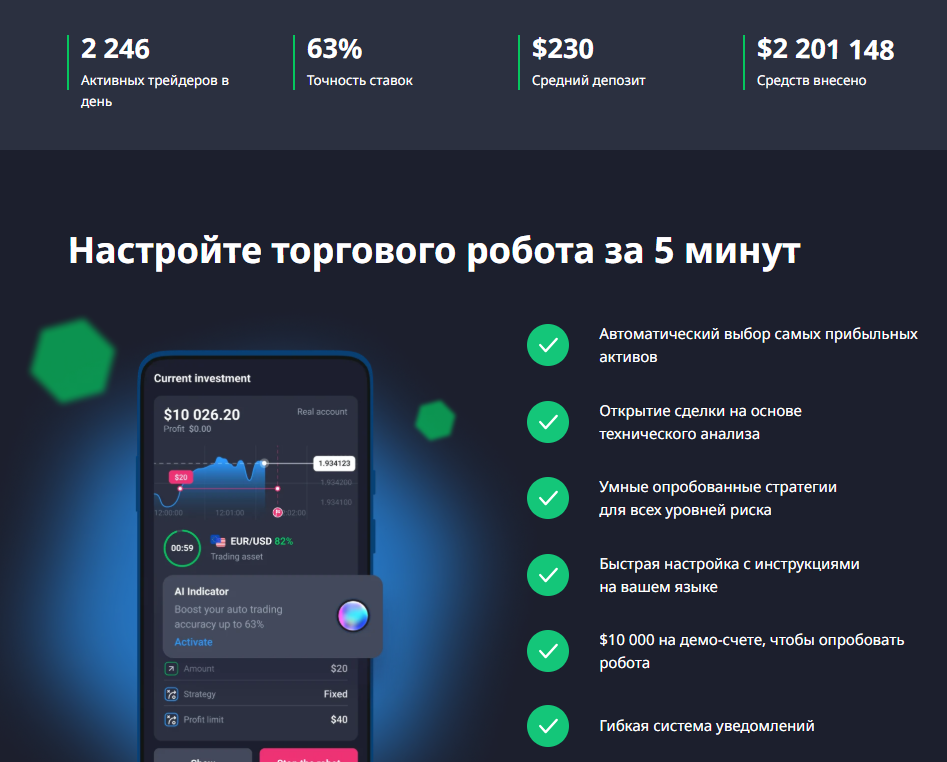 Основные офферы проекта – автоматизация сделок, инструменты для аналитики и управления торговыми стратегиями. Сервис поддерживает более 100 активов. Статистика проекта гласит, что услугами компании пользуются свыше 2 тыс. активных трейдеров ежедневно, а точность ставок составляет 63%. За время существования площадки внесено свыше 2 млн. долларов инвестиций. Сделки открываются на основе технического анализа, также основатели предлагают быструю настройку торгового робота, поддержку языка клиента и 10 000 долларов на демо-счет для изучения инструментов ресурса.