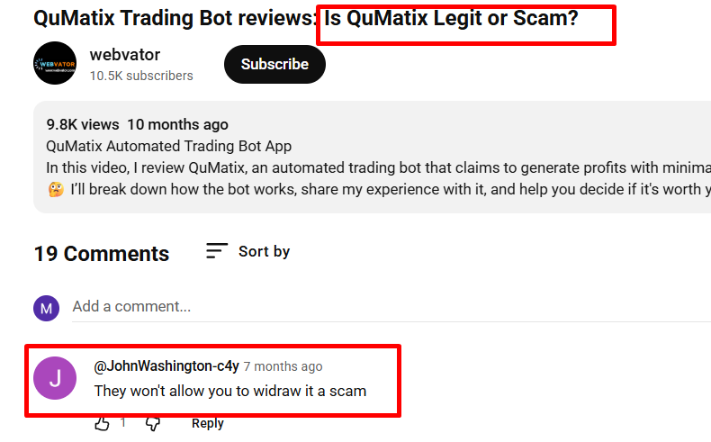 К обзору Qumatics на Ютьюб пользователи сообщают, что платформа не даст вывести деньги и работает как скам.