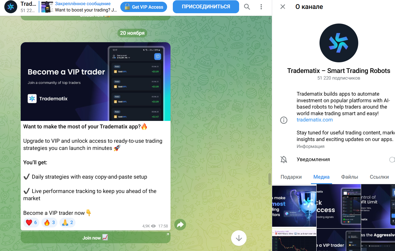 Комментарии открыты только к некоторым постам. Паблик ведется на английском языке. В записях ведущий рассказывают о впечатляющих результатах VIP-клиентов Tradematix.