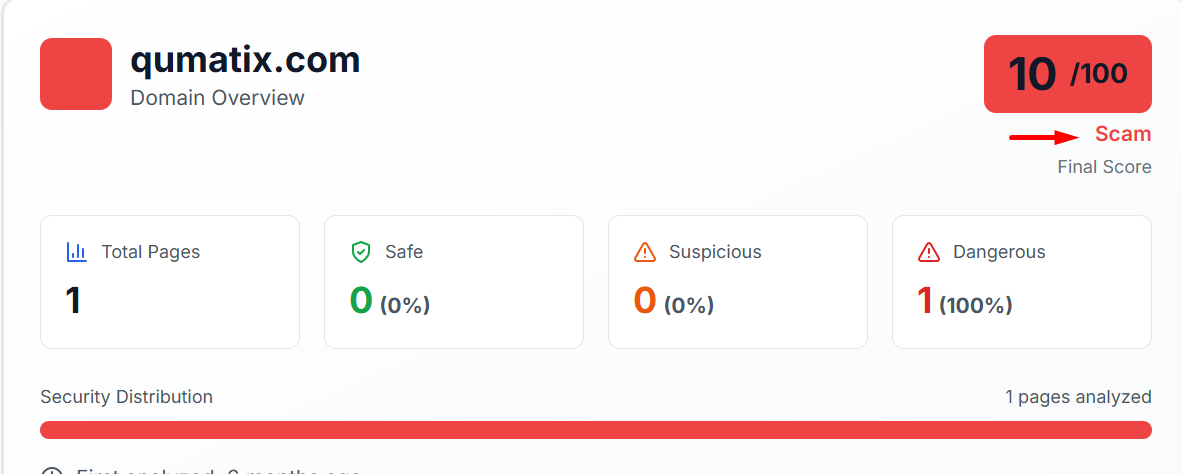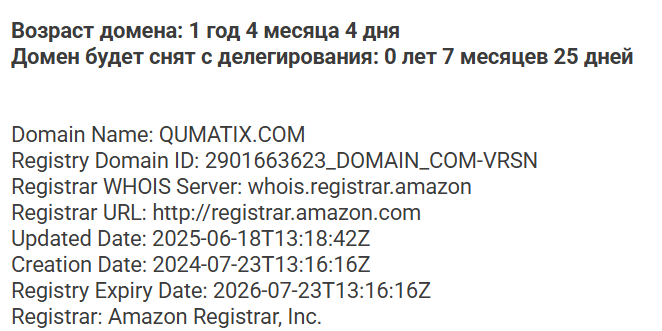Доменное имя Qumatix зарегистрировано в июле 2024 года. На момент обзора платформа не проработала и полтора года.