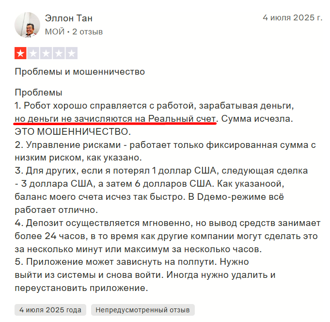 Есть отзывы о Qubot и на англоязычном портале-отзовике TrustPilot. Пользователь делится своим опытом – робот зарабатывает деньги, но на реальный счет они не зачисляются. Высокие риски манипуляций с графиками и отсутствие выхода на реальную биржу. При этом в демо-режиме “работает все отлично”, что еще раз доказывает бессмысленность изучения мутной площадки в тестовом варианте.