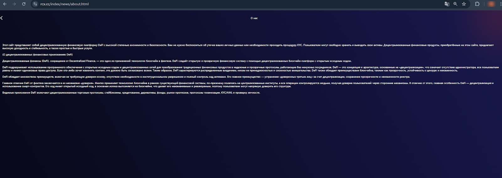 Заявлено, что платформа является децентрализованной – то есть, разработчик не хранит у себя активы пользователей, а платформа работает напрямую с блокчейнов. При этом подтверждений этим словам не предоставлено, а о разработчике сервиса Rcx сс нет никакой информации.