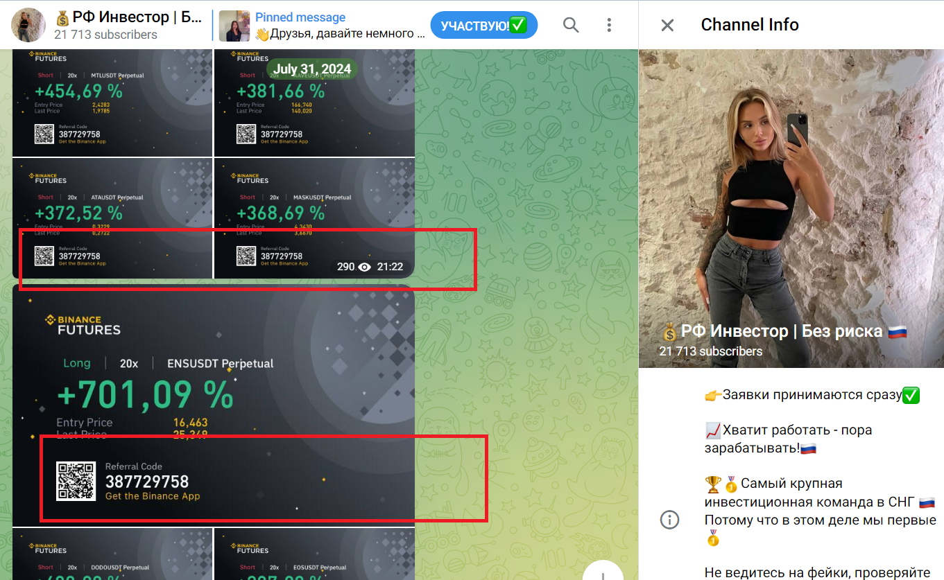В тгк Rf Investor Bez Riska изначально публиковались скриншоты сделок с бирж, но подтвержденных отчетов при этом не было. На скринах Ульяна оставляла партнерские коды, и на реферальной программе получала прибыль.