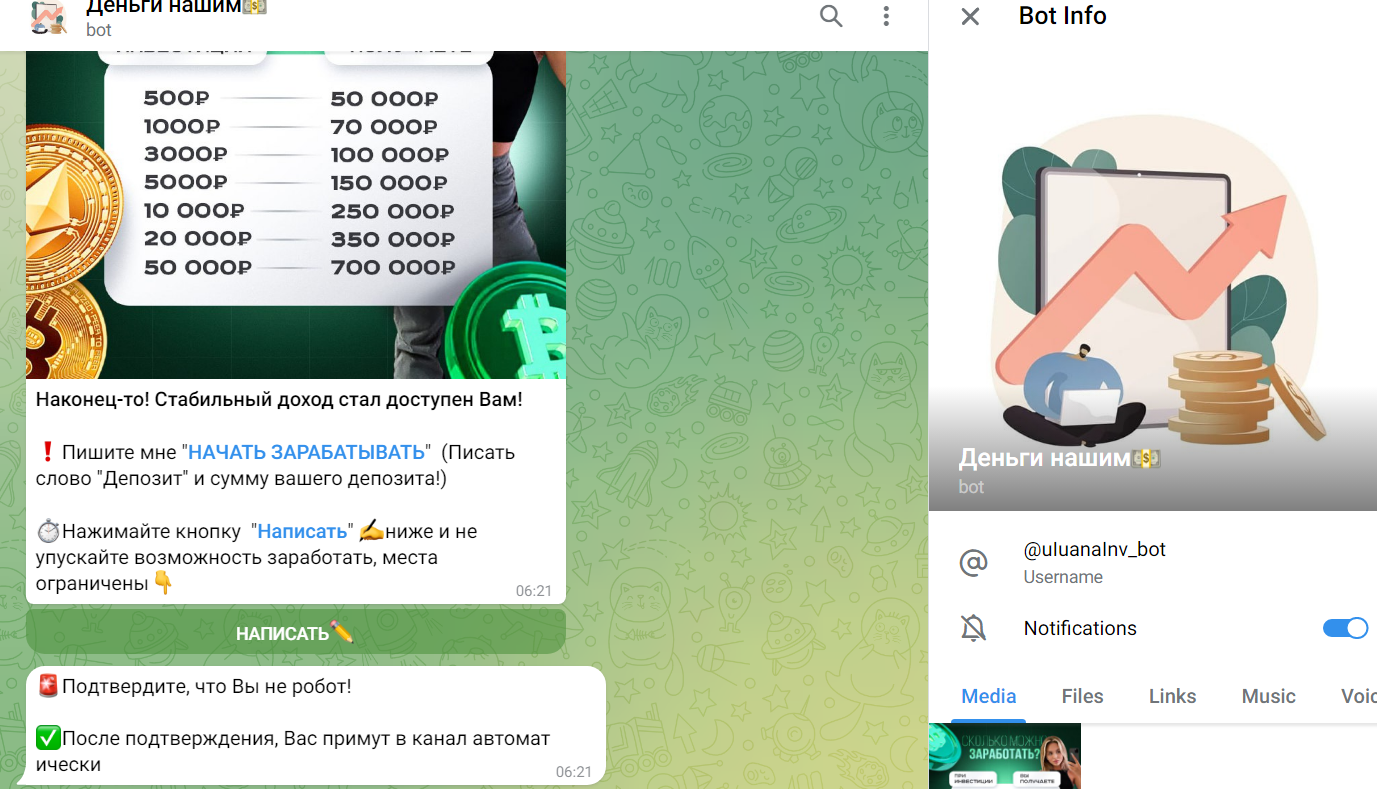 Телеграмм канал РФ Инвестор Без Риска имеет закрытый доступ. Когда человек отправляет запрос на подписку, автоматически переходит к боту Uluanalnv bot. Здесь пользователю рассказывают о способе получения дохода и предлагают сразу приступить к работе. Еще желательно подтвердить, что человек не является роботом, но это действие не обязательное.