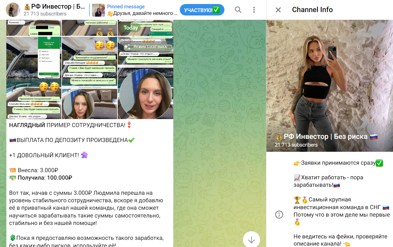 РФ Инвестор Без Риска — это Телеграмм-канал, основатель которого продвигает услугу по доверительному управлению. Ульяна рассказывает о многолетнем опыте работы в области инвестиций и обещает увеличить капитал клиентов в 100 раз. Если сделки будут неудачными, создатель тг-канала предлагает возврат денег, но далее мы расскажем о данном проекте правду.