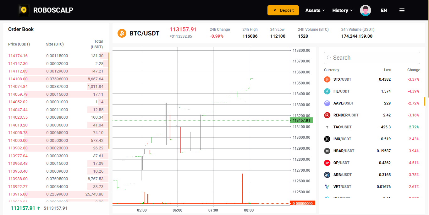 Онлайн-терминал Roboscalp выглядит подозрительно, такой интерфейс неоднократно использовали создатели мошеннических сайтов. В нем отсутствуют инструменты для технического анализа, а график показывает некорректные значения, иногда просто замирает. Работать с таким инструментом невозможно и чревато потерей средств.