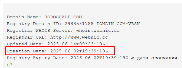 Проверка домена через сервис WHOIS показала, что сайт зарегистрирован в июне 2025 года. Уже одно это вызывает сомнения, ведь серьезные проекты обычно имеют более долгую историю. Доверять новичку торговый депозит — опрометчивое решение.