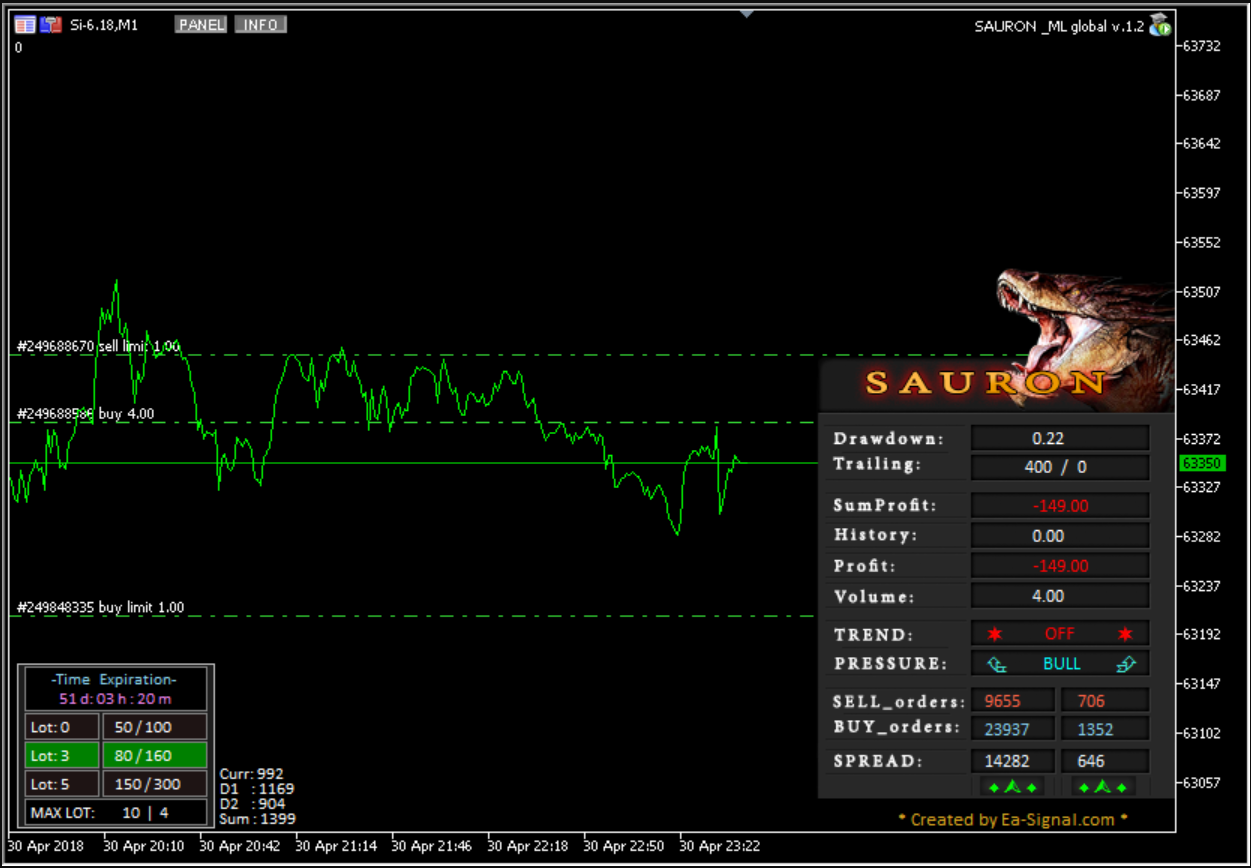 Работа SAURON ведется с расширениями диапазонов исходя из волатильности. Можно устанавливать фильтр тренда, от которого зависит уровень риска и предполагаемая прибыль. Робот учитывает указанные в ТС объемы в стакане. Далее он запоминает стоимость, проводит анализ на тест объемов. После фиксируется до трех уровней и проводится анализ имеющегося объема, чтобы убедиться в его актуальности. «Саурон скальпинг» вычисляет подставные объемы и проводит прочие манипуляции, чтобы определить подходящую лимитную заявку.Во время работы программа обнаруживает цены плотности и отображает их на графике с момента определения стоимости устанавливается лимитная заявка по указанному объему. Когда заявка сработала, то бот переключает алгоритмы и начинает работать в режиме сопровождения. Если ордер становится прибыльным, то программа его закрывает встречной заявкой или за счет функции трейлинга. Это может быть в фиксированном режиме, когда трал начинается при достижении указанной прибыли. Второй режим является динамическим. Здесь задается доходность начального лота. Если позиция станет больше начального лота, то увеличится и сумма активации.