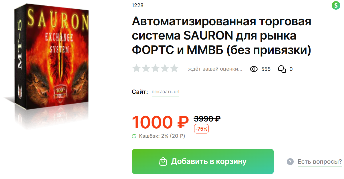 Указывается, что программа SAURON exchange system может применяться в режиме умеренной торговли что будет давать около 5% прибыли. Есть режим агрессивного трейдинга, который может обеспечить 20% доходов. Пользователи получают шаблоны для работы, а также документацию к данному роботу. Торговля тут ведется скальпингом в стакане от плотности. Для одного инструмента предполагается депозит от 100 тысяч рублей. Предположительно у программы есть пробный месячный период, в течение которого можно отказаться от покупки и получить назад полную стоимость.
