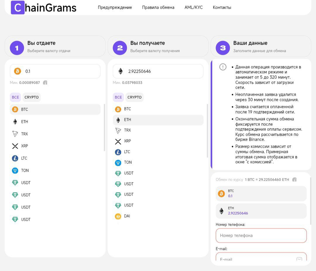 На данный момент название обменника изменено на Chaingrams. Операции там занимают от 15 минут до 24 часов, в зависимости от выбранной пары. Регистрация не требуется. Все транзакции гарантированно защищены. Служба поддержки оперативно ответит на вопросы клиентов. Можно осуществлять международные переводы. Также обналичивать USDT и другие криптовалюты в более чем 35 городах мира. Платформа сотрудничает с банками России и других стран, а также оплачивает счета в Азии и Европе.