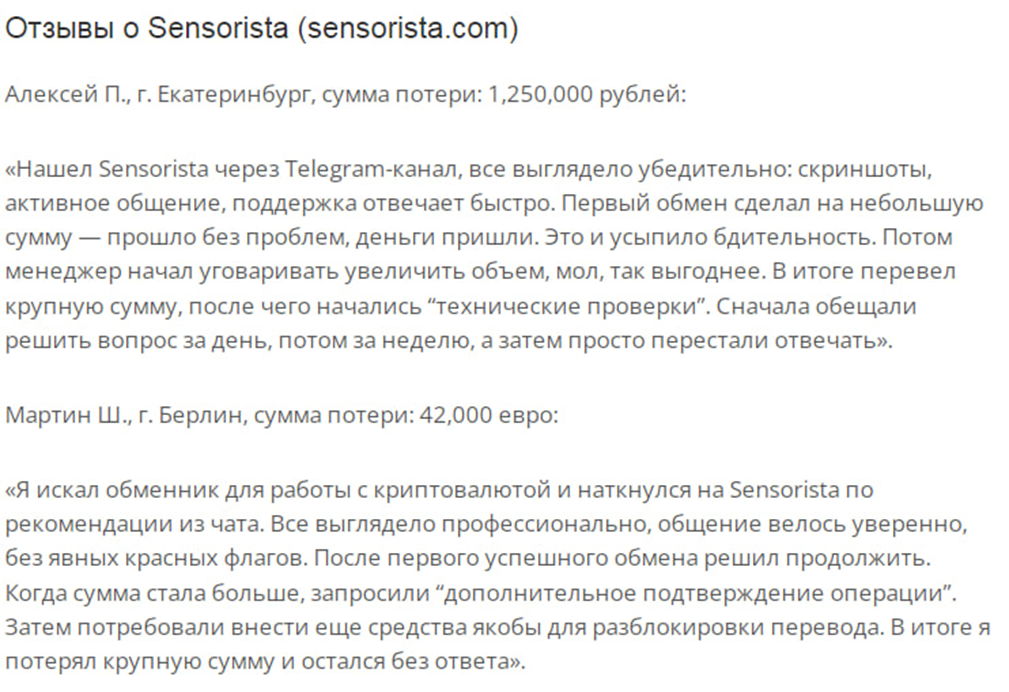 Мы проанализировали обменник Sensorista и можем сделать вывод, что это мошенники. На это указывают:
