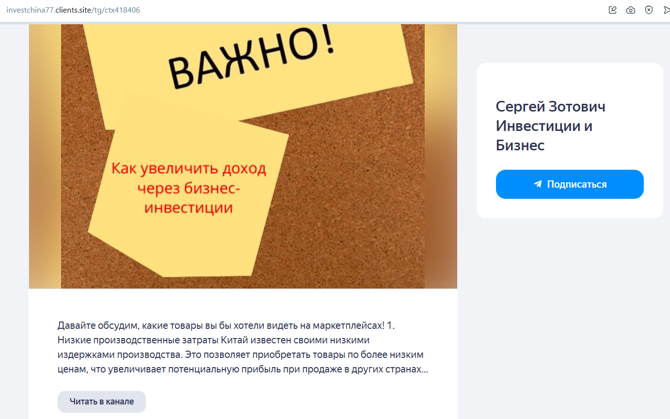 У него есть лендинг по адресу investchina77, где он делится своим подходом к бизнесу, вдохновляющими мыслями и идеями по развитию торговли. Все оформлено просто и понятно, без излишеств, но с упором на личную подачу.