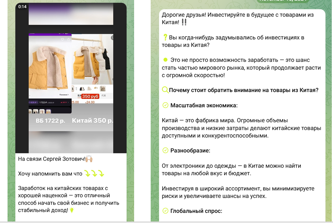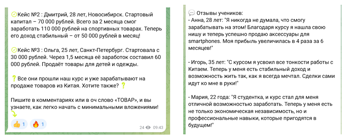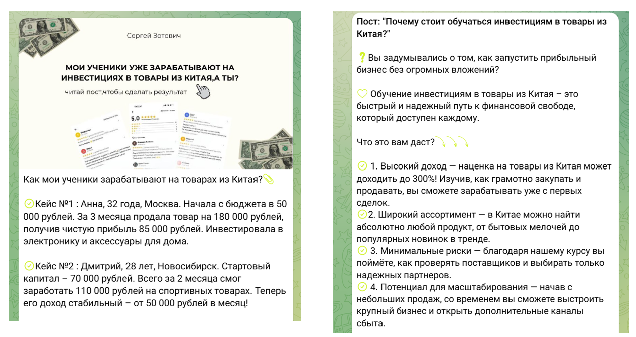 Основной посыл: любой может начать зарабатывать на китайских товарах с минимальными вложениями, если довериться Сергею. На этом и построена воронка продаж: эмоциональные кейсы, цифры, дух наставничества и обещания быстрого роста.