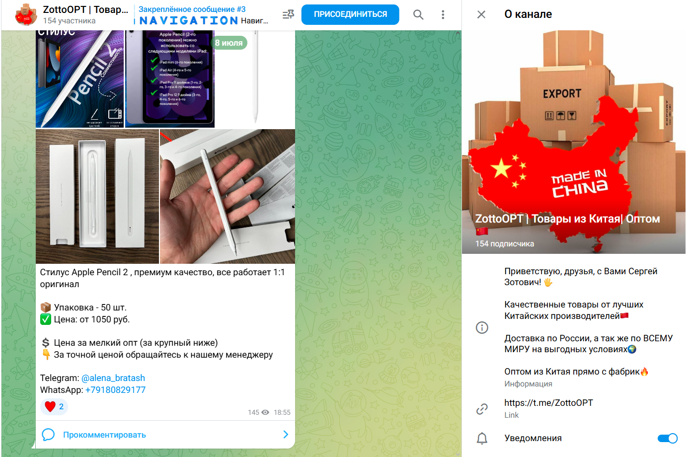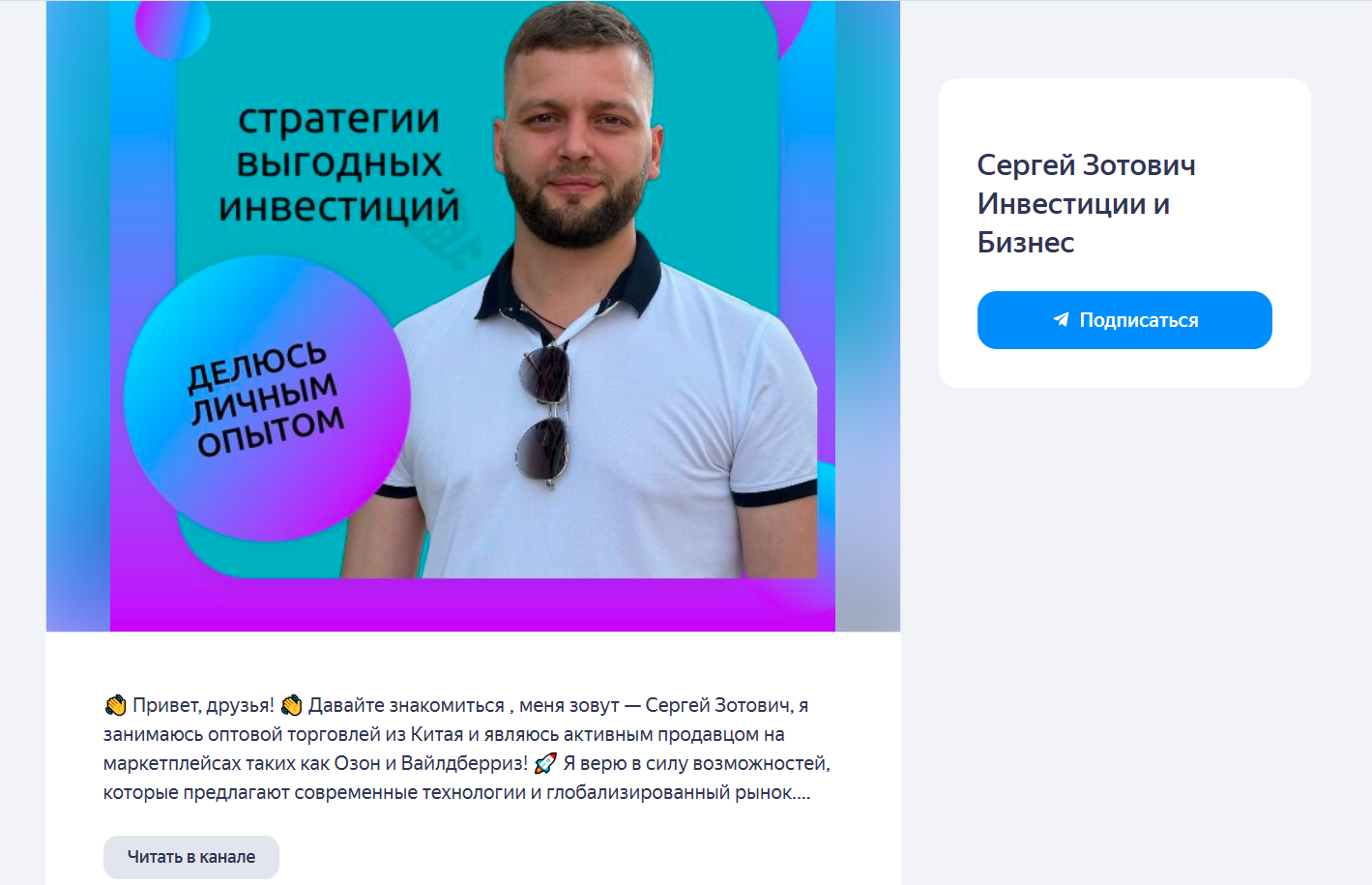 В ТГ он ведет два канала: “Сергей Зотович Инвестиции и Бизнес” с 12-ю подписчиками и “Zotto OPT”, посвященный оптовым закупкам, на котором 154 подписчика.