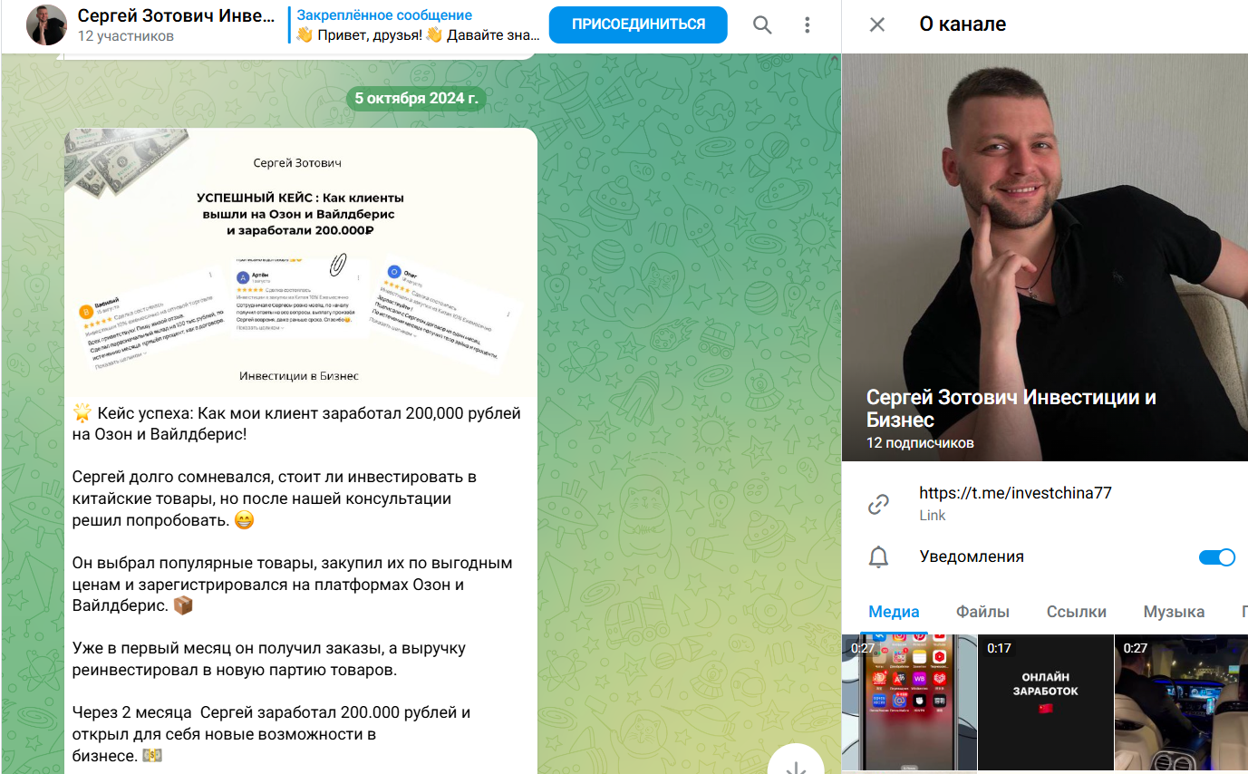 Из контента ясно, что С. Зотович делает ставку на практику: работает напрямую с поставщиками из Китая, продает товары через маркетплейсы вроде Ozon и Wildberries и предлагает желающим вложиться в этот процесс.