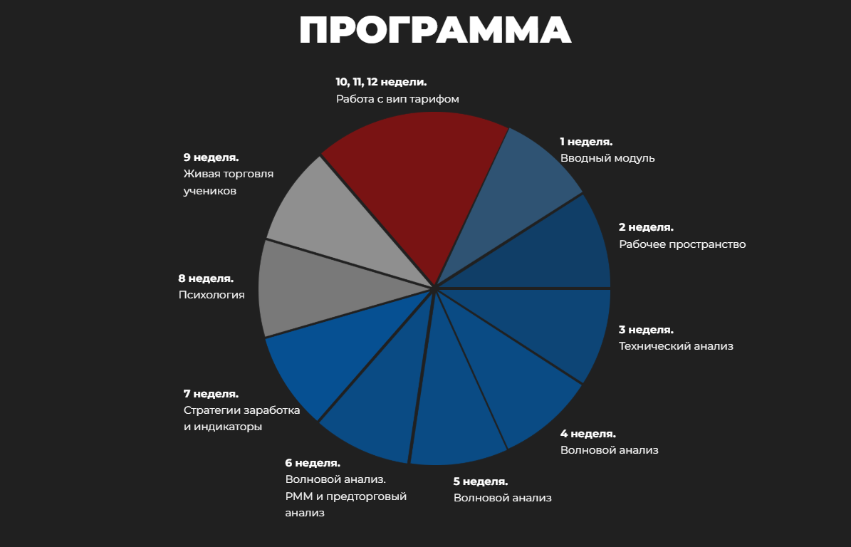 Программа, презентованная на сайте, показывает обучение по неделям. Основной курс длится 9 недель, с 11-й по 12-ю неделю продолжают обучаться только клиенты, купившие vip-тариф.