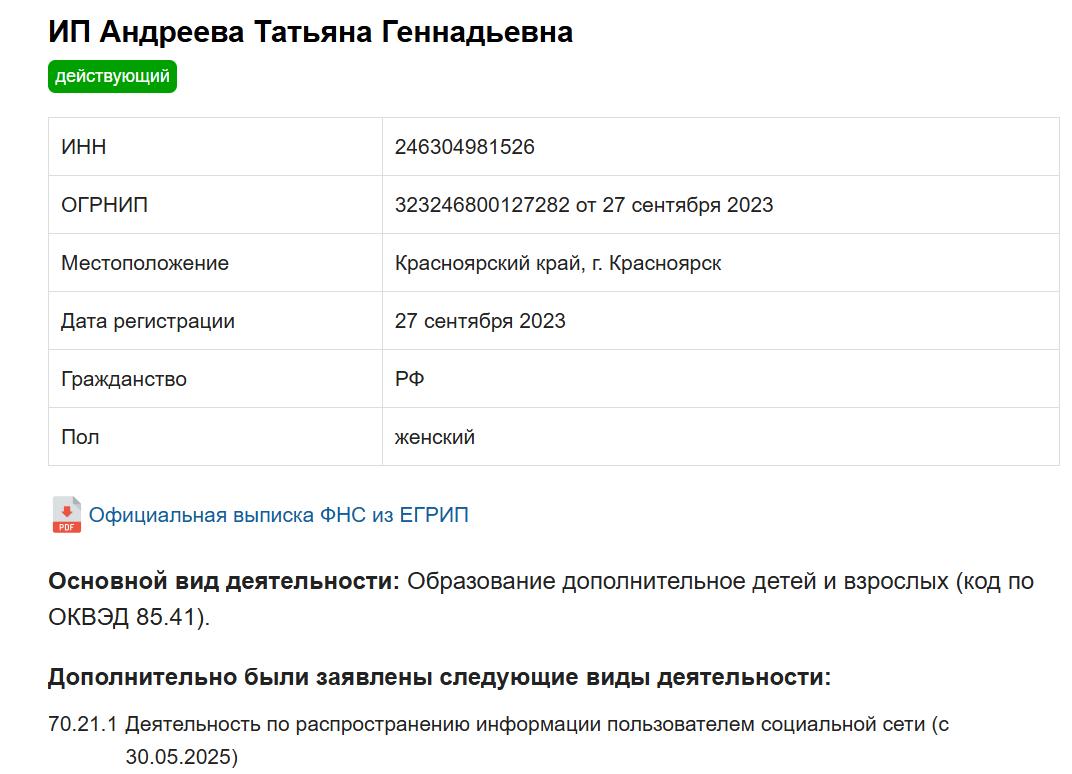 Ранее от лица ИП Андреевой Т.Г., деятельность которой была прекращена в 2021 году, проводилось образование в области культуры. В 2023 году ИП было зарегистрировано повторно.