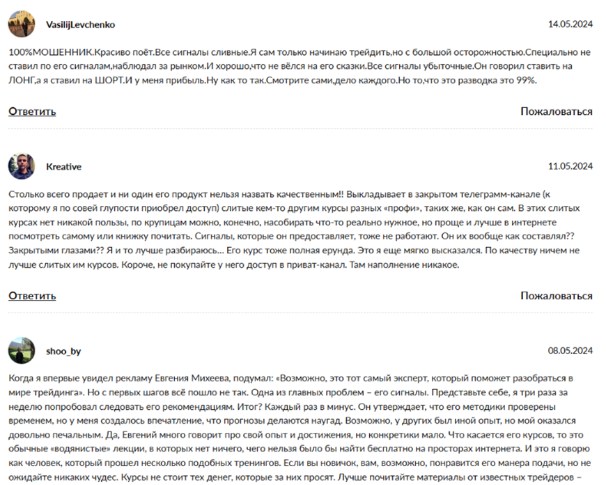После завершения проверки Miheevschool мы узнали, что обучение у этого трейдера не принесет положительные результаты. Евгений Михеев предоставляет учебные курсы, а также открывает доступ в платное сообщество с сигналами и предлагает личное наставничество. Все услуги дорогостоящие. Но никакие документы, подтверждающие право предоставлять образовательные услуги, не опубликованы. Значит, блогер не может передавать опыт в трейдинге. Да и отзывы свидетельствуют о том, что сотрудничать с Евгением не следует. Мы нашли ряд недостатков проекта: