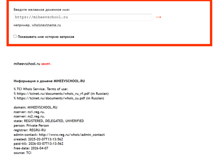 Автор школы Miheevschool позиционирует себя опытным трейдером, у которого якобы есть большой стаж в этой сфере. Но проверка показала, что доменное имя зарегистрировано совсем недавно – 07.03.2025 г. А продлено оно до этой же даты ровно на год. Значит, нельзя говорить о длительной работе площадки.
