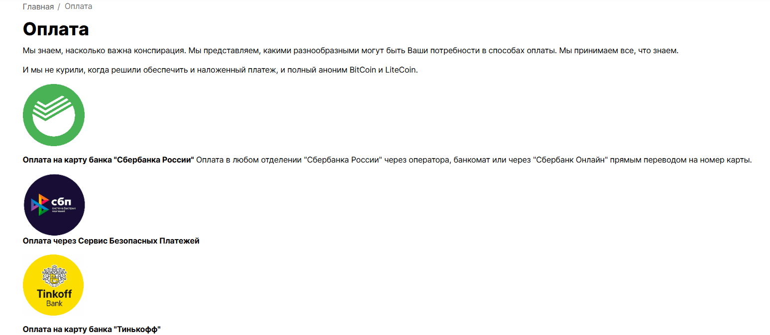 В числе доступных платежных систем предусмотрена даже криптовалюта, которая позволяет оставаться анонимными. Если говорить точнее, то это BitCoin и LiteCoin. На декабрь 2025 года доступен и наложенный платеж, то есть оплата при получении – до ₽15,000. Sovoc 22 xyz предлагает доставить посылку по конкретному адресу или до отделения почты. Во втором случае предусмотрена дополнительная комиссия в размере 2%-3%.