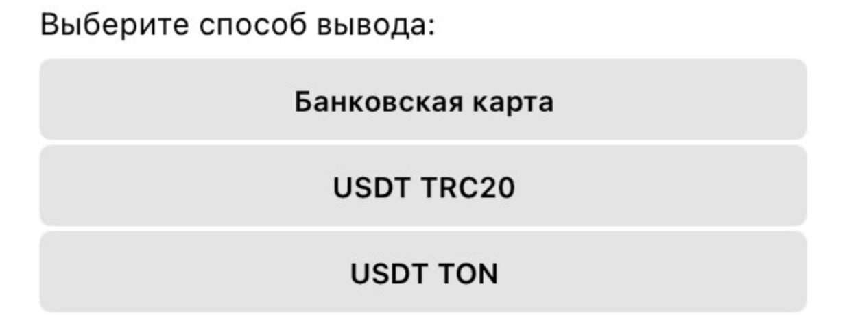 На выбор доступны следующие варианты для проведения транзакций — банковская карта, USDT TRC20 или TON. Автор утверждает, что это доступная и простая схема. При этом она якобы гарантированно работает.