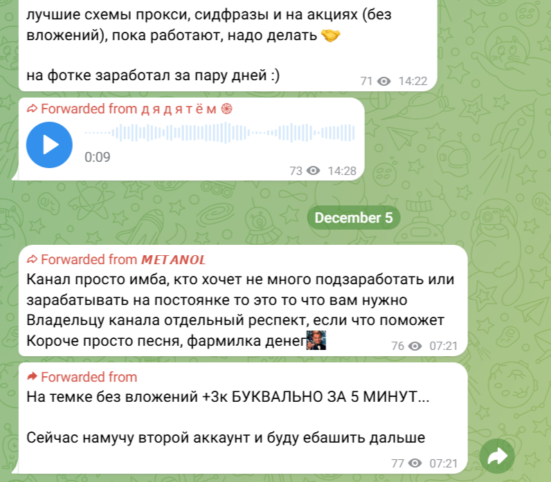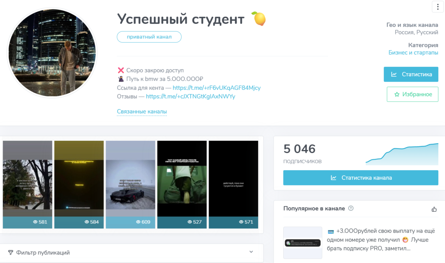 Рассматриваемый канал позиционируется как открытый проект в Телеграмме с инструкциями по заработку на разных “темках”. На середину декабря 2025-го к сообществу подписано немногим больше 5000 человек. Этот показатель весьма высокий, но по факту он не соответствует действительности. Реальная аудитория — не больше 13-14%. Именно это количество пользователей в реальности читает публикации канала.