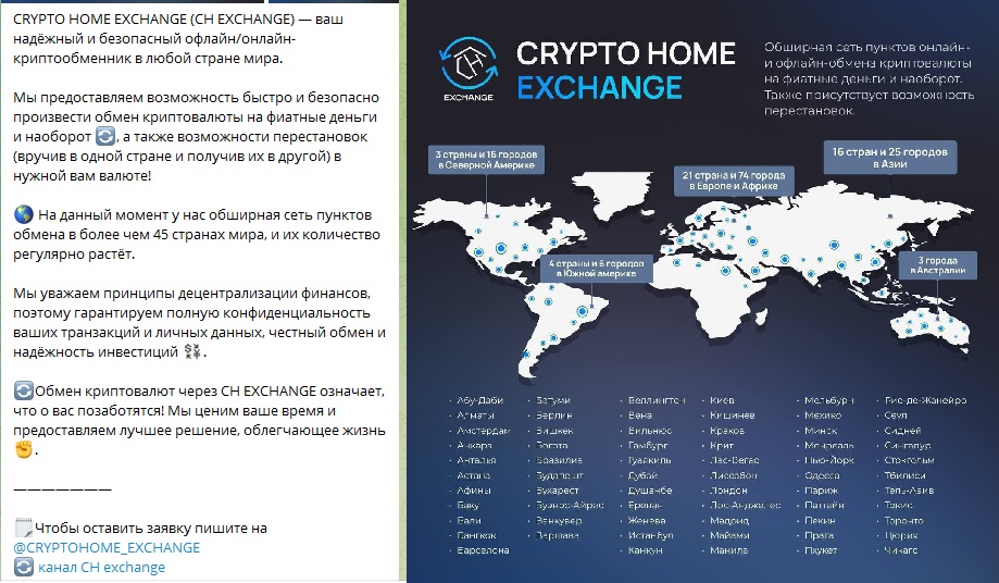 Еще одно предложение, которое запущено в рамках проекта Крипто Дом — криптообменник. Для него создан канал Crypto Home Exchange (@ch_exc), админ @CRYPTOHOME_EXCHANGE. Владелец обещает обмен криптовалют и фиата во многих городах и странах, минимальная сумма от 2 тыс. долларов, максимальная — 10 тыс. Возможны онлайн и офлайн обмены, в любом случае нужно писать в личку.