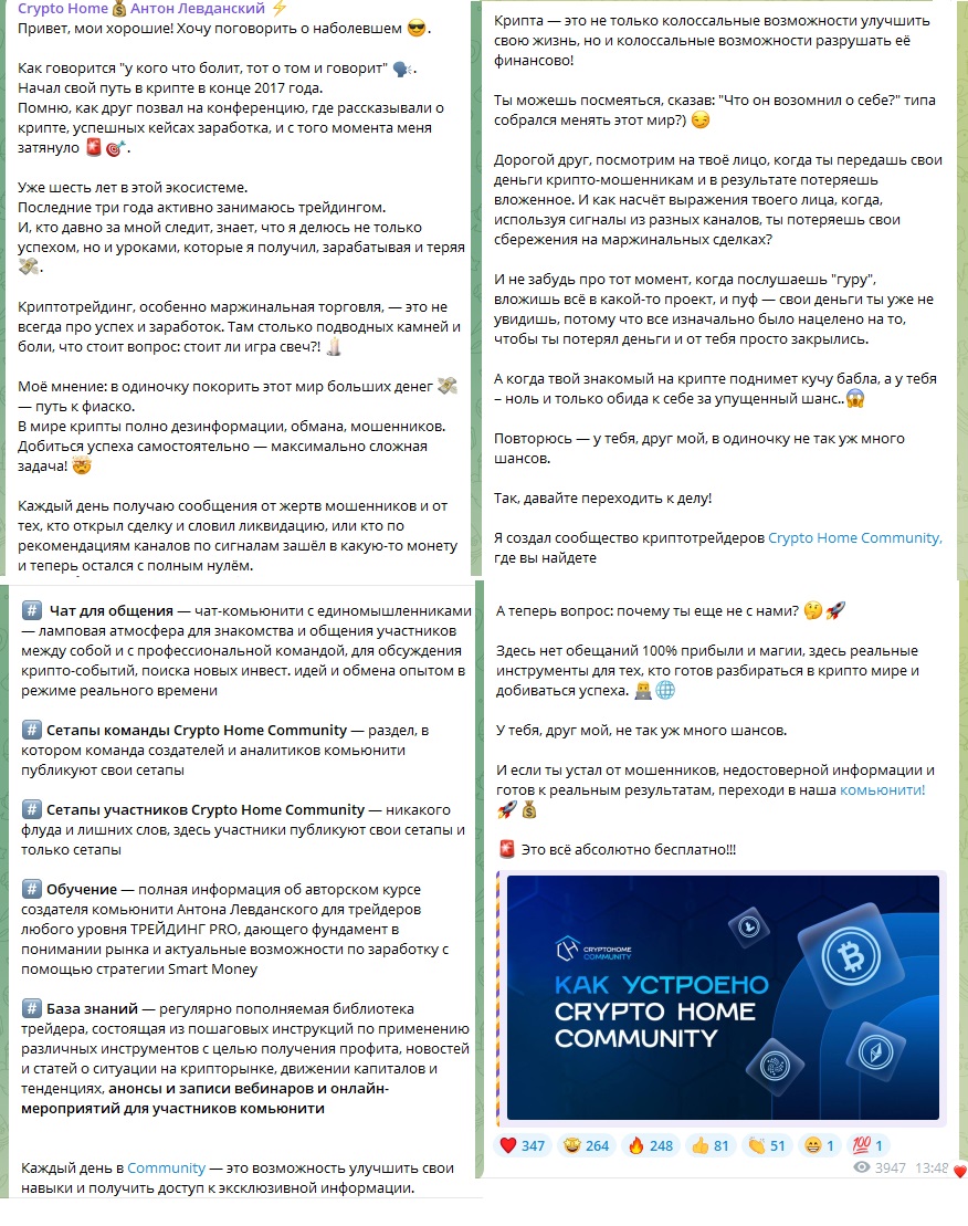 Первым интернет-ресурсом, который Антон запустил 15 января 2022 года, стал ТГ-канал @cryptohome7. Активной раскруткой этого паблика занялась его жена. У Sofia Stuzhuk в Телеграм есть несколько блогов, где общее количество в 2022 превышало 500К, там, а также в Инстаграм, она размещала посты с семейными фото и ссылками на аккаунт мужа, где он “доступно” рассказывал о крипте. В декабре 2023 название канала изменили на Антон Левданский, а в апреле 2025 он стал “Crypto Home Антон Левданский”. Контакты админа Crypto Home (@CH ADMIN7) или CH ADMIN (@CH ADMIN77). На канал подписано 39К человек, пик по количеству был в конце июля 2025, тогда было 110к подписчиков. Сейчас идет сильный откат, фолловеры массово покидают паблики Софии и Антона.