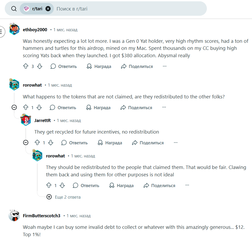 Tari активно продвигал раздачи токенов за участие в тестнете, майнинг, NFT и активности. Однако после запуска многие участники оказались разочарованы. Люди, которые потратили деньги, время и ресурсы, получили аллокации на десятки или сотни долларов, что выглядит несоразмерным ожиданиям.