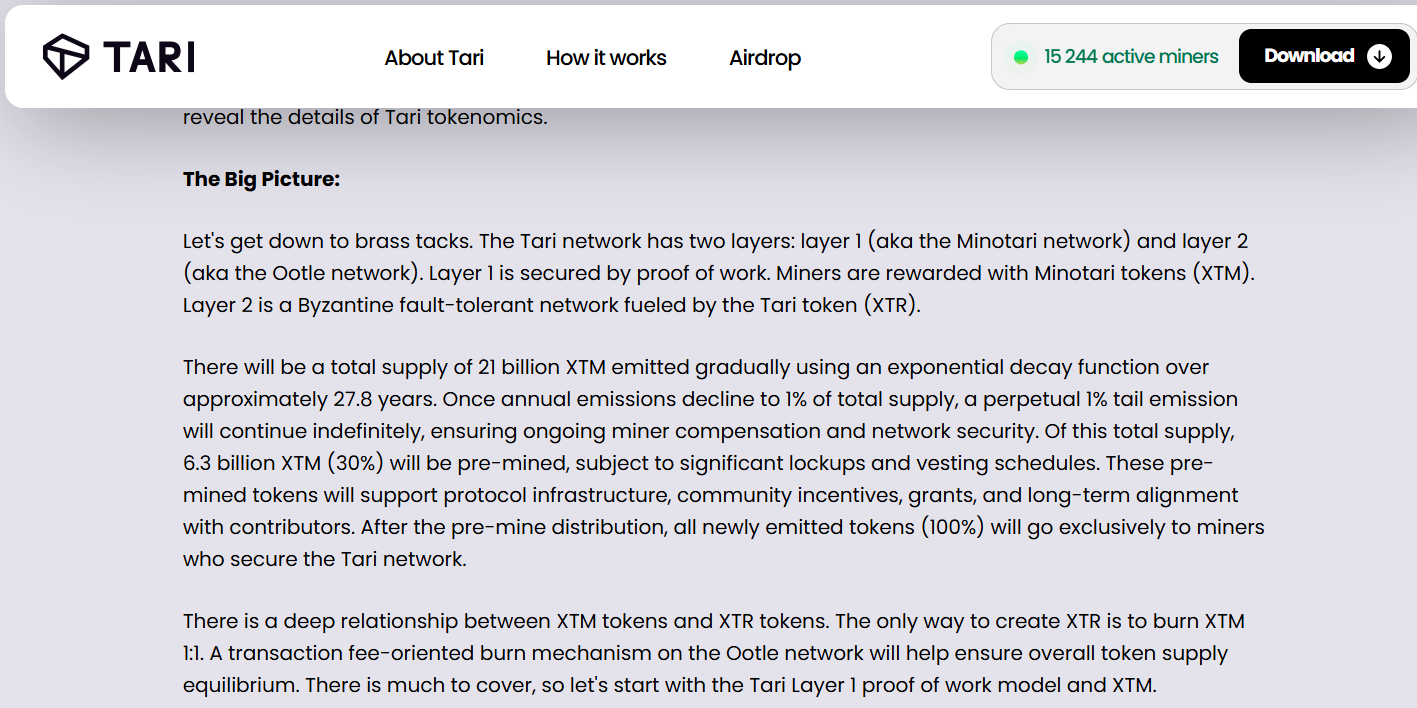 Сайт оформлен современно и основной посыл простой: запускаете приложение Tari Universe на Windows, macOS или Linux, включаете майнинг и начинаете зарабатывать XTM, помогая защищать сеть.