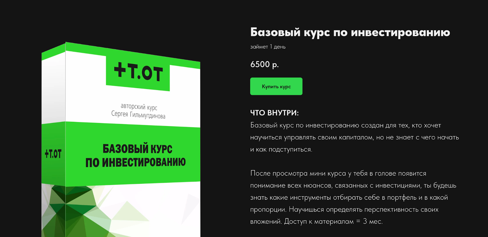 Для самостоятельного обучения собраны 5 курсов: «Правила VSA», «VSA-анализ и Риск менеджмент», «Базовый курс по инвестированию», «Универсальная точка входа», «Волны Эллиотта и Риск менеджмент». Стоимость за 1 материал варьируется от 6500 рублей до 30 тысяч руб.