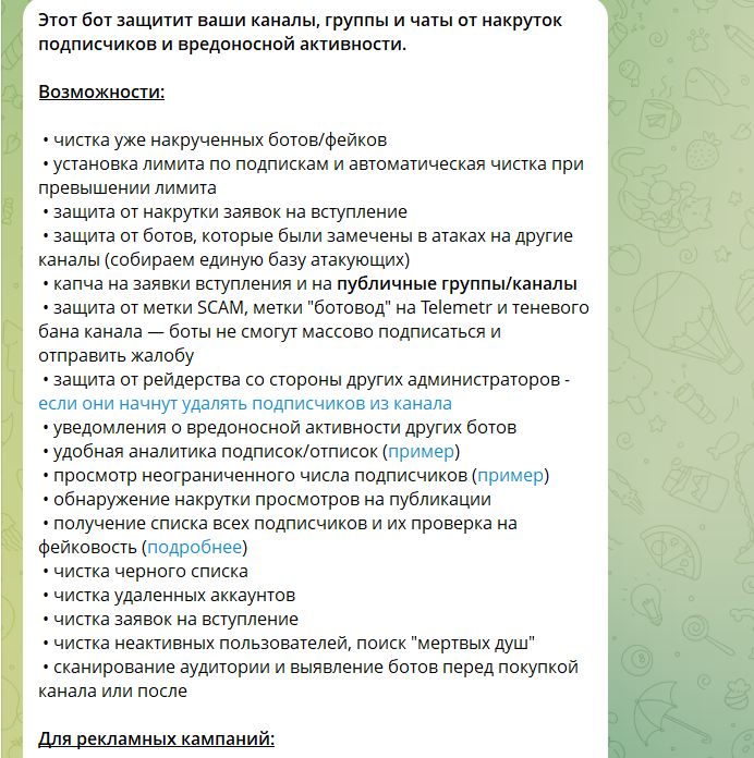 Телеграм-бот TGuard предлагает большое количество возможностей, связанный с анализом аудитории и поиском ботов: