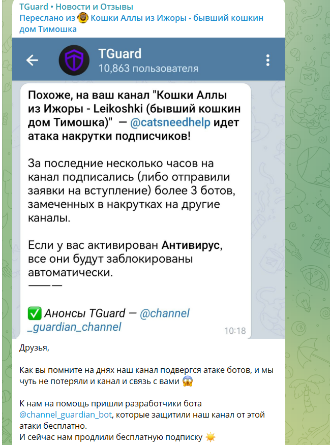 Отзывы о боте TGuard публикуются в телеграмм-канале проекта в виде кейсов. Как правило, это пересланные сообщения из каналов клиентов, поэтому такой фидбэк можно считать правдивым. Например, создатели паблика про кошачий приют рассказали, как с помощью «ТГуарда» спаслись от атаки ботов бесплатно.