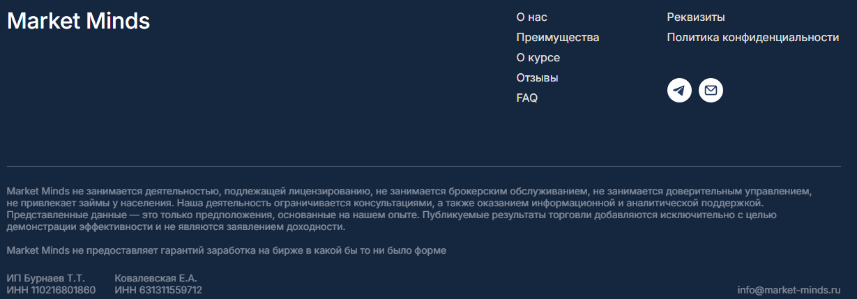 Верить таким сведениям, мы считаем, что не стоит. Кроме официального источника в сети нигде больше нет пользовательского фидбека. А значит, отзывы могут быть просто сгенерированы или куплены. У Тимура нет лицензии, во всяком случае он скрывает информацию о ее наличии. У самой компании «МаркетМайндс» сертификата, выданного Российским Центробанком, также нет. Следовательно, финансовая деятельность этой конторы никак не регулируется. Лидер Market Minds ничем не подтверждает свою компетентность в трейдинге, и, вероятнее всего, торговать на рынке он на самом деле не умеет. Единственное направление его деятельности заключается в продаже платных курсов. Но таких предложений на рынке сейчас очень много, поэтому фальшивый торговец решил устроить акцию и привлекать людей в скам-систему, обещая бесплатное обучение. Которое на самом деле стоит 47 000 рублей. Мы не верим, что Timur просто такой щедрый.