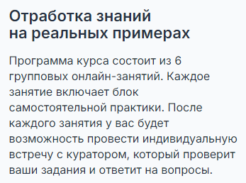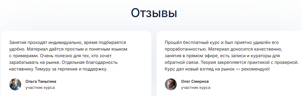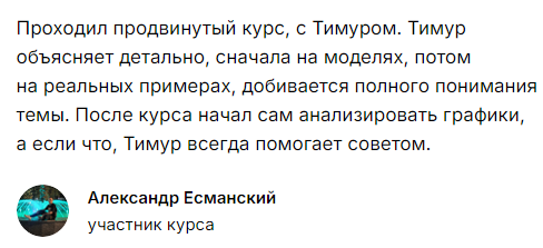 Опытный трейдер Тимур Бурнаев оказывает людям квалифицированную поддержку на протяжение всего процесса обучения на проекте. Куратор утверждает, что делает акцент больше на практике, чем на теории. Благодаря такому методу большинство участников эдюкейшн системы после окончания курсов уже начинают закрывать сделки в плюс. Программа состоит из 6 онлайн-занятий.