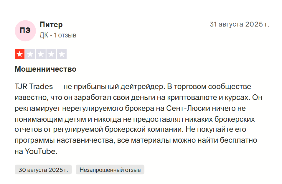 Трейдер TJR предлагает курс трейдинга, но польза его обучения не доказана. В сети есть как позитивные, так и негативные отзывы. Легальная деятельность не подтверждена. Советуем покупать программы у известных и проверенных экспертов в сфере трейдинга.