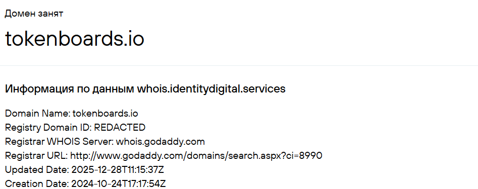 «ТокенБоардс» позиционируется создателями качественным и надежным. При этом в открытом доступе нет никаких официальных документов, демонстрирующих юридический статус компании. Верифицированную статистику проведенных сделок и успешных выплат TokenBoards тоже не предлагает. Проверка самого сайта показала, что он был создан в 2024 году, а обновлен 28.12.2025.