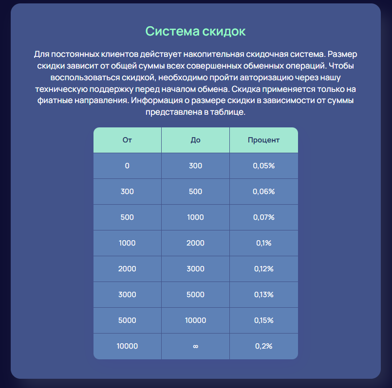 Для постоянных и активных клиентов действует специальная система скидок, но они применяются только на фиатные направления. Максимальный размер бонуса – 0,2%. Его можно получить при совершении операций на сумму от 10,000 – валюта не уточняется.