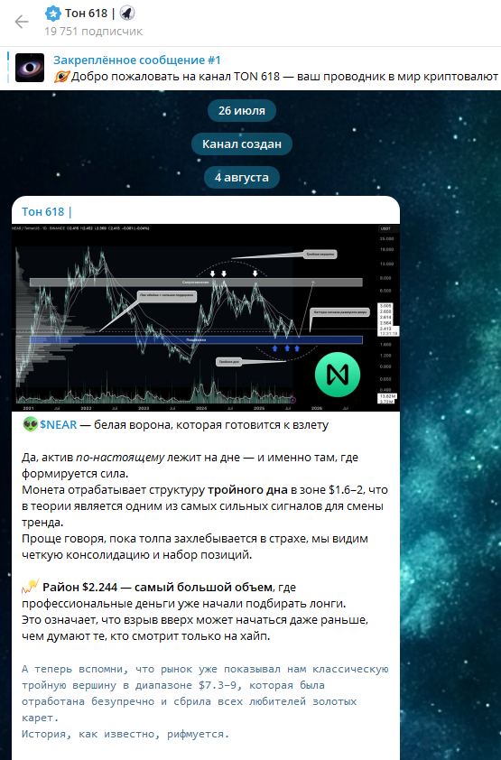 Телеграмм-канал «Тон 618 |» создали в июле 2025 года, а первые публикации появились только в августе. При этом почти за 2 месяца активной работы проект смог привлечь 19 751 подписчика, что якобы позволяет назвать трейдера успешным и известным.