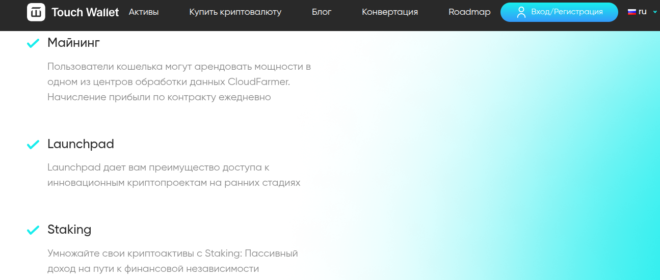Как стало ясно исходя из детальной проверки, пользователей криптовалютного кошелька «Тауч Валлет» сразу встречает мини список с преимуществами. Создатели цифровой платформы по всей видимости решили, что плюсы без детального разъяснения касательно механики работы помогут привлечь внимание. Сразу скажем об эфемерности преимуществ, так как они ничем не подкреплены. Ниже вы увидите особенности цифрового проекта.