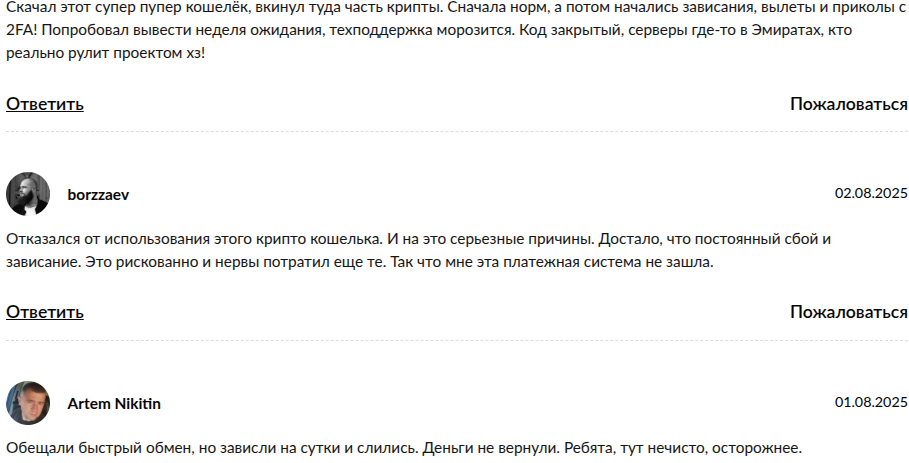 - Отзывы о криптокошельке в сети негативные. Пользователи жалуются на задержку в обработке транзакции.