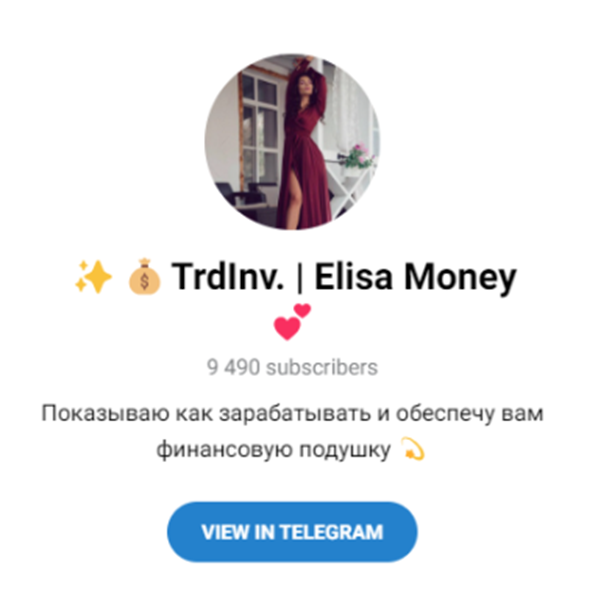 Автор TrdInv Elisa Money не рассказывает о своей деятельности. Отмечает, что она простой щедрый человек. При проведении бесплатных конкурсов пользователям переводится более 100 тыс. рублей. Такое предложение настораживает. Сомнительно, что Елизавета отправляет деньги людям, которых не знает. На канале отсутствует реклама и нет информации о предложении услуг.